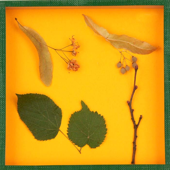 Natürliche Objekte,präpariert und montiert, Blüte, Doppelfrucht, Blatt, Winterzweig.