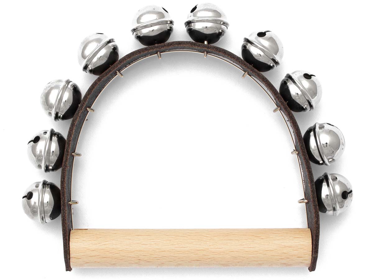 An dem kindgerechten Griff aus heimischem Buchenholz wir ein schmales Lederband befestigt. Darauf sind die zehn Schellen montiert.