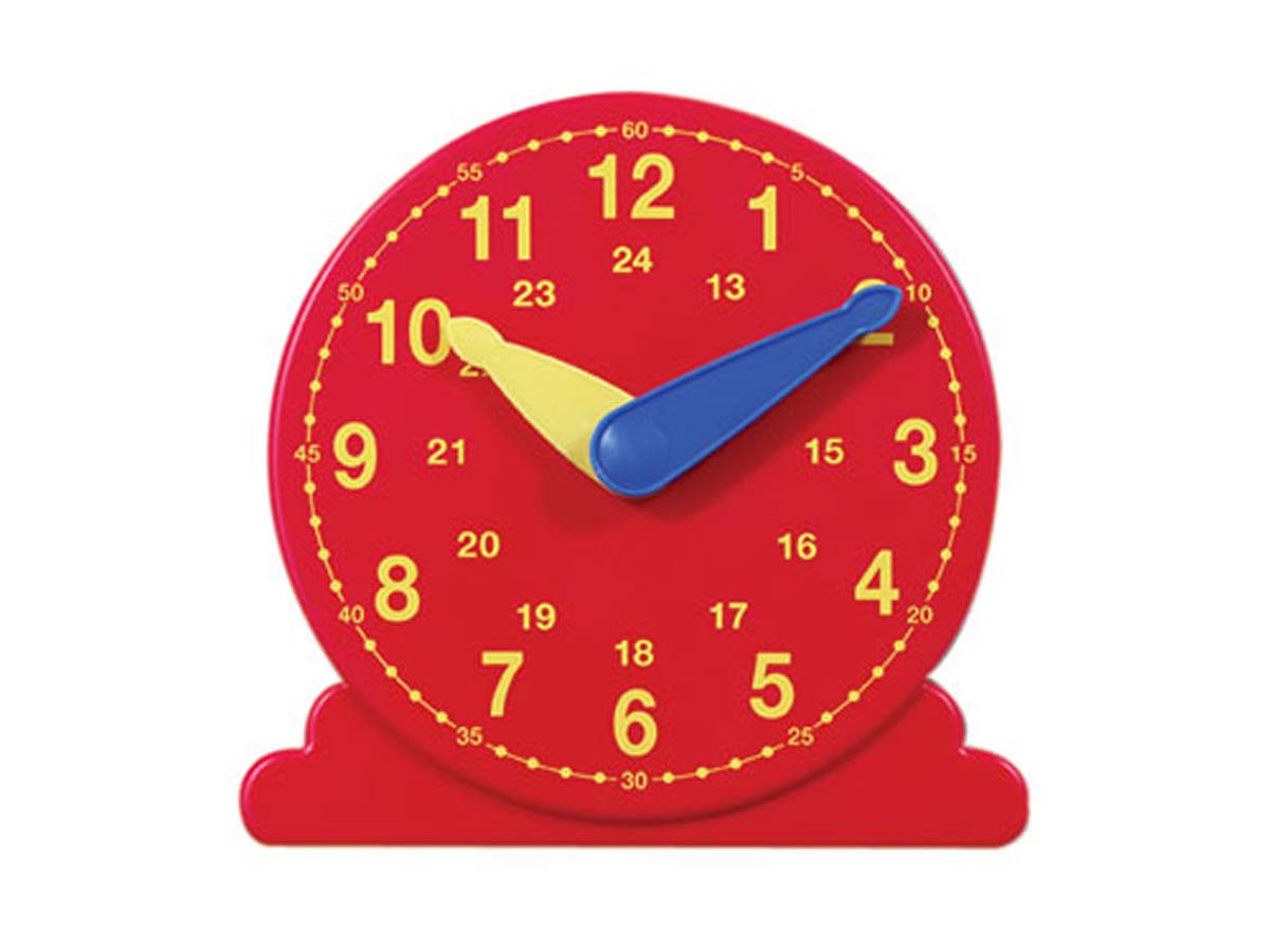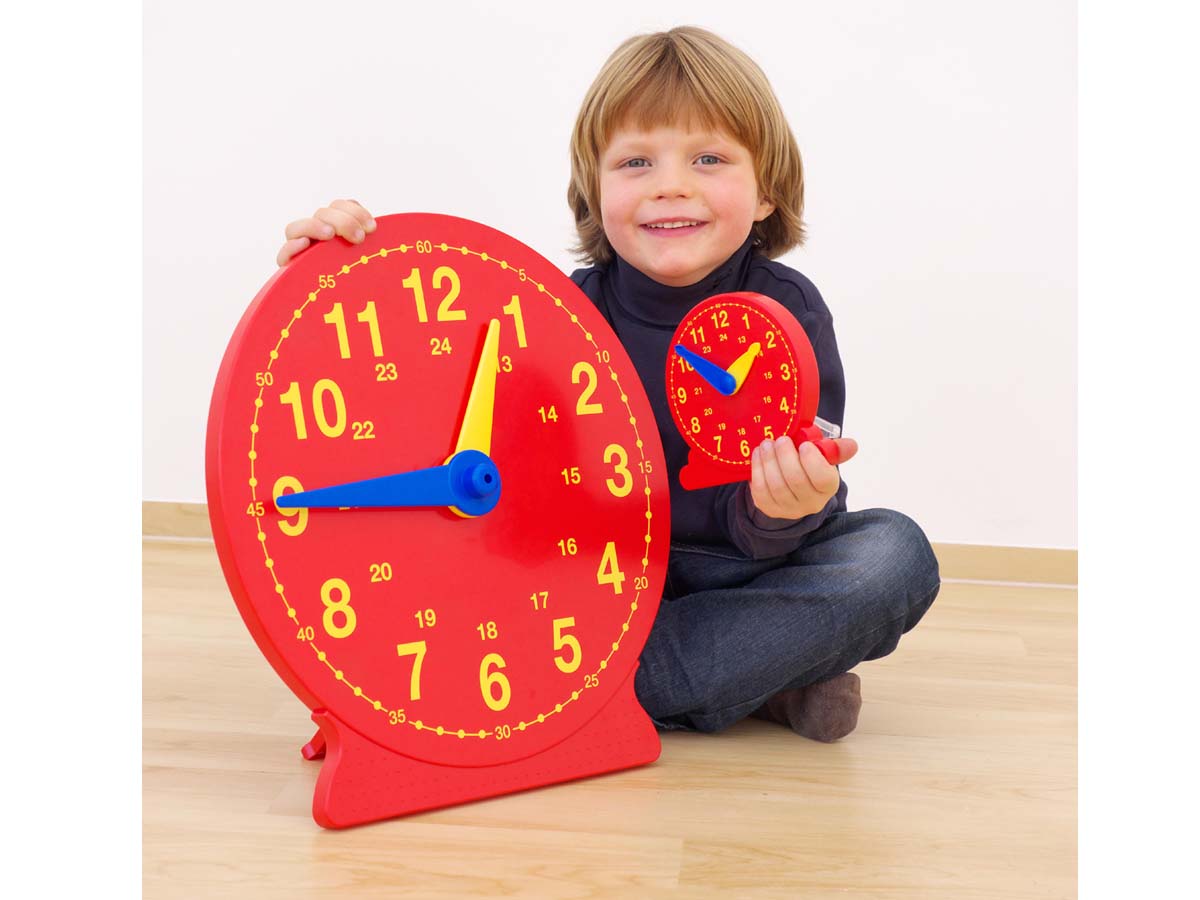 Wenn die Kinder mit der gleichen, nur kleineren Uhr selbst experimentieren dürfen, dann wird das recht schwierige Rechenthema leichter verstanden.