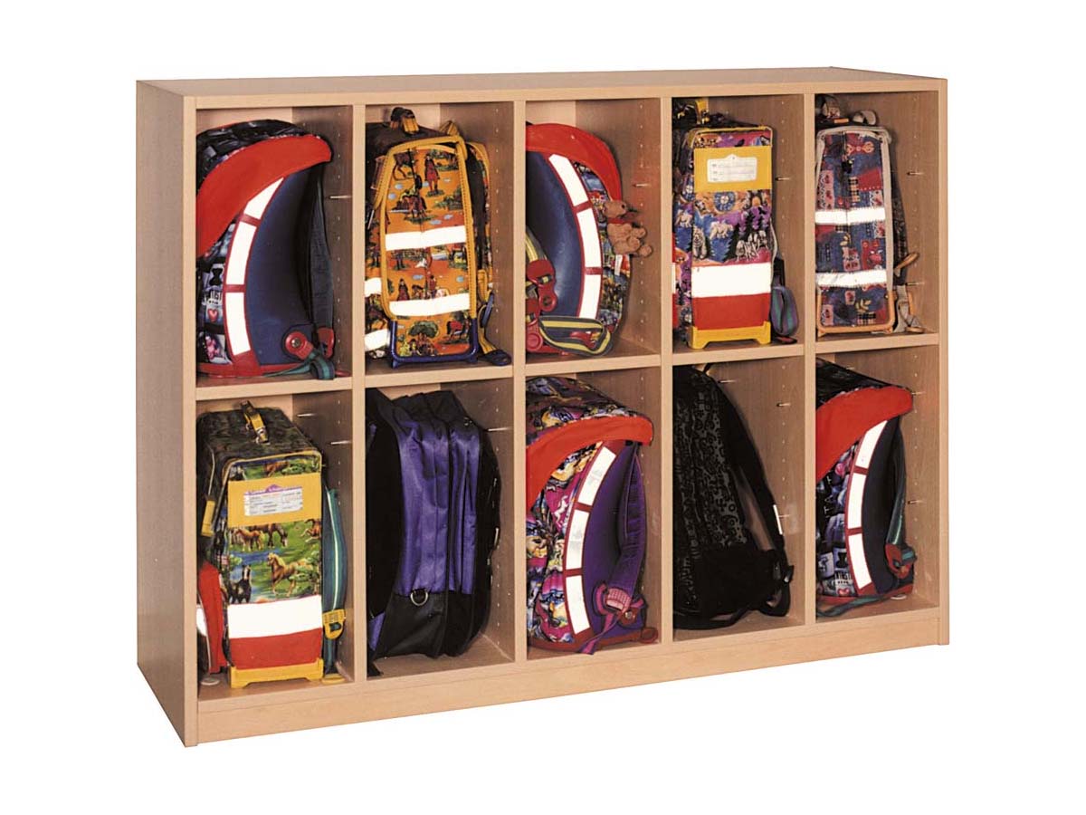 Schulranzen-Regal mit Gefachen und verstellbaren Einlegeböden.