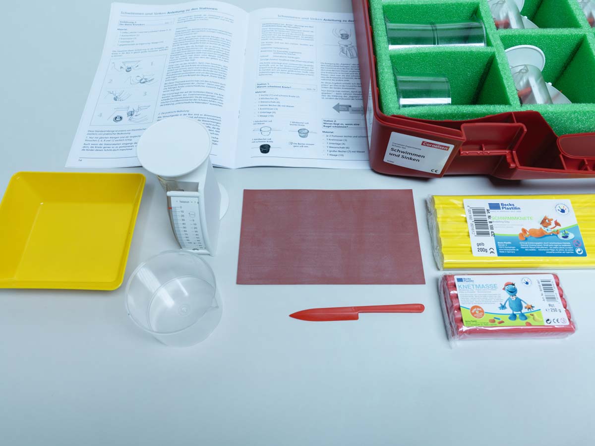 Im Mittelpunkt der Stations-Versuche, die in Partnerarbeit durchgeführt werden sollen, stehen Schiffe, die schwimmen und sinken als konkreter Sachbezug. Die „Schiffe“ formen die Kinder aus zwei verschiedenen Sorten Knete: aus einer Knete, deren spezifisches Gewicht leichter als Wasser ist und die deshalb schwimmt und aus einer anderen, deren spezifisches Gewicht schwerer als Wasser ist und die sinkt, sofern man sie nicht in eine schwimmfähige Form bringt. Die Kneten sind farblich unterschieden und können so von den Kindern bestimmt werden. Außerdem befinden sich Kugeln und ein Würfel aus den Materialien in der Sammlung, aus denen Schiffe gebaut werden: Holz, Stahl, Aluminium und Kunststoffe. Mit einer Waage kann der vermeintliche Gewichtsverlust eines Körpers beim Eintauchen in Wasser bestimmt werden.