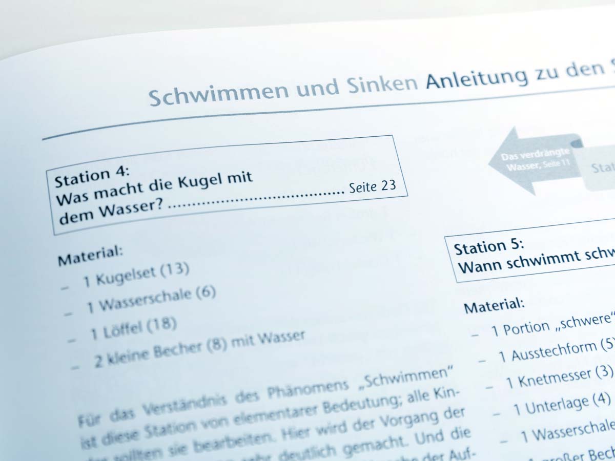 Als Versuchsanleitung für die Teile der Experimentierbox dient das Heft „Schwimmen und Sinken“ aus der Reihe Experimentieren an Stationen in der Grundschule des Cornelsen Scriptor Verlages. Das Heft ist im Lieferumfang der Experimentierbox enthalten. In diesem Heft finden Sie Versuche an 14 Stationen, die mit den Materialien der Box durchgeführt werden können.