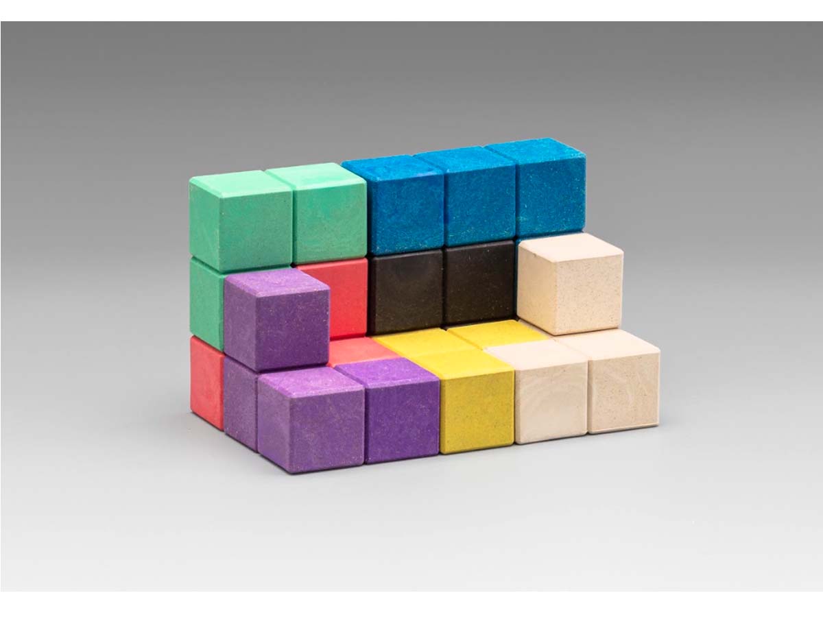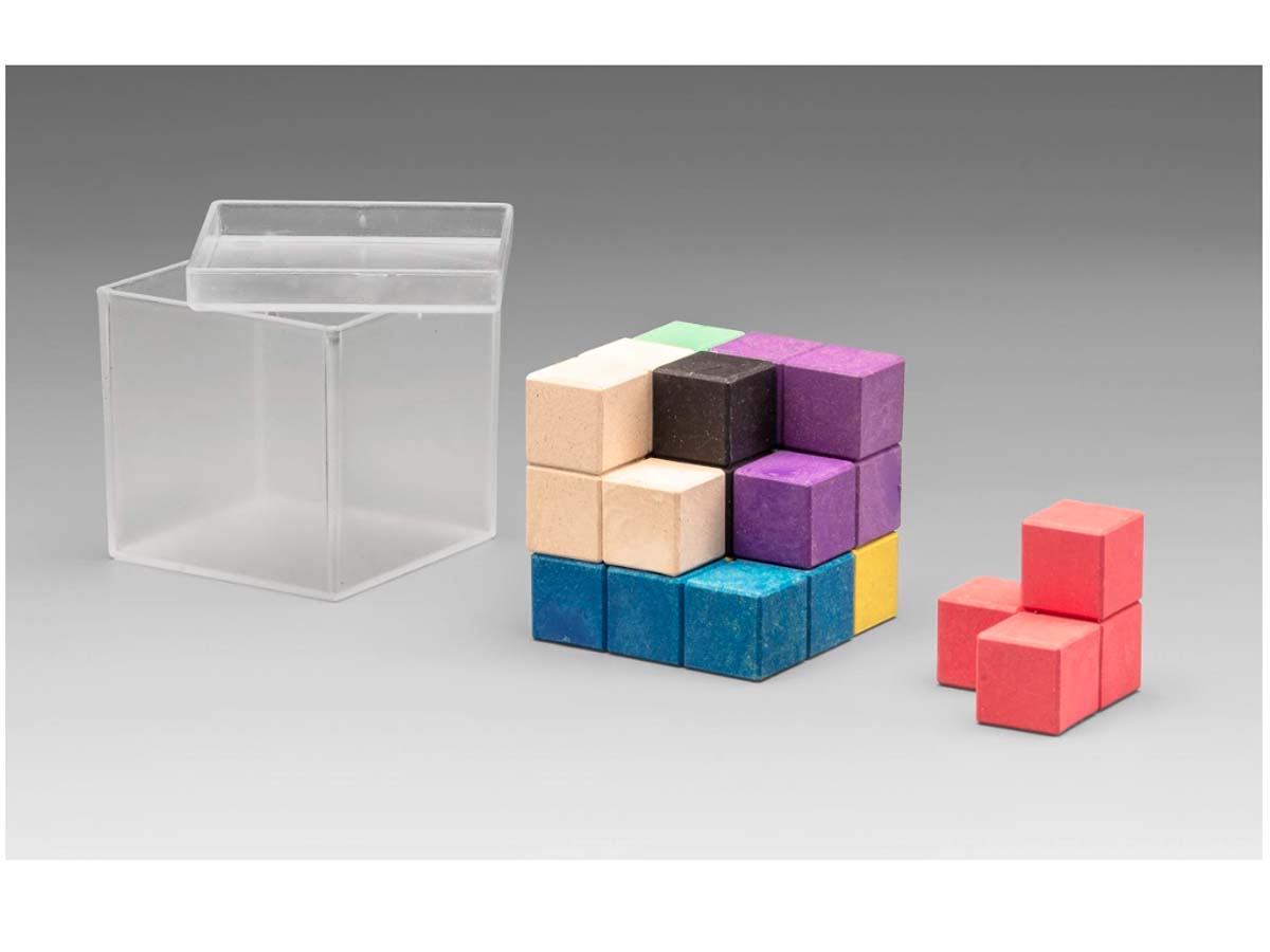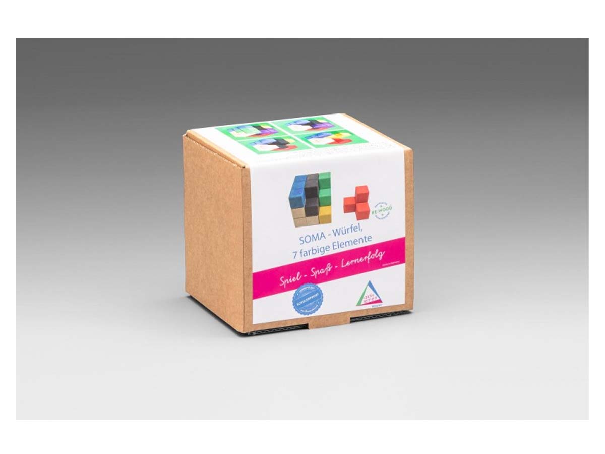 Soma – Würfel (6 x 6 x 6 cm) aus RE-Wood® aus 7 Teilen in den Farben rot, blau, weiß gelb, grün , lila und schwarz. Die unterschiedlichen Teile sind jeweils aus 4 bzw. 3 Einzelsteinen zusammengesetzt.