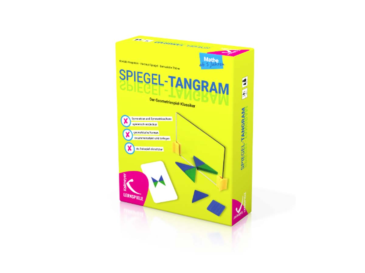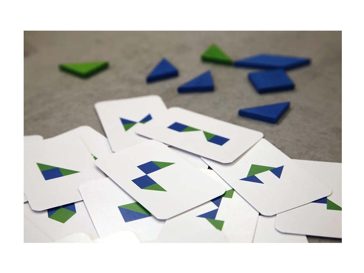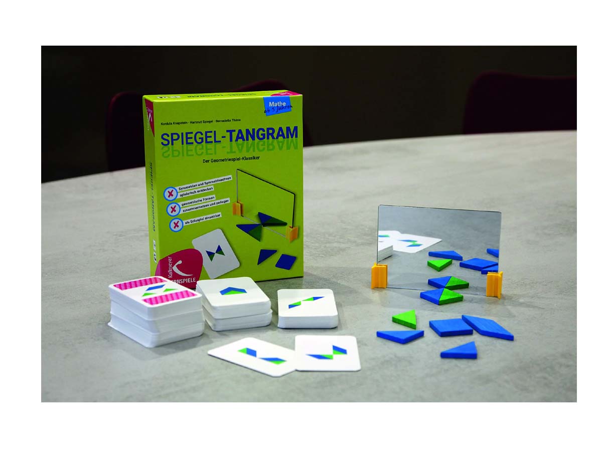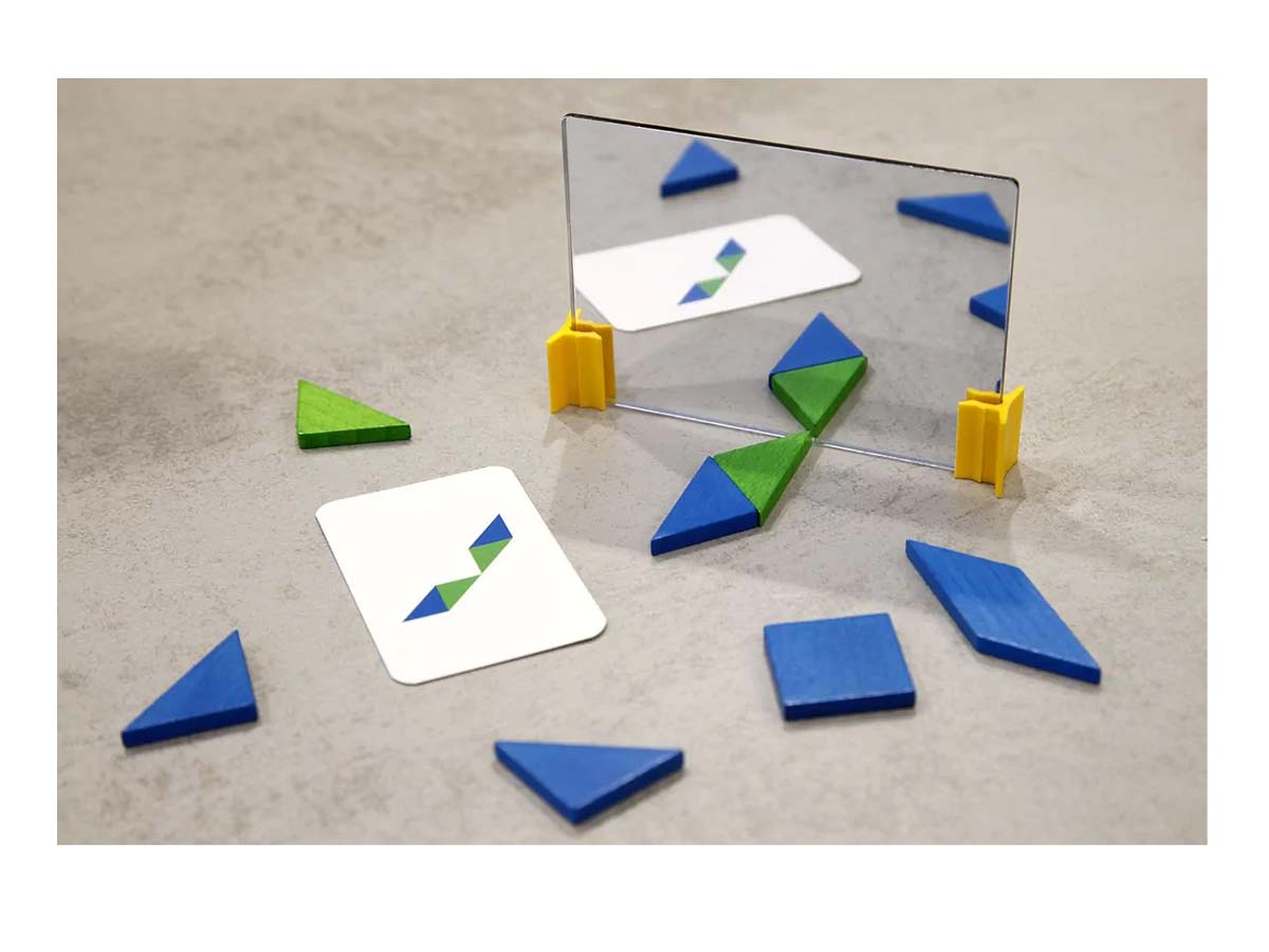 Die Formenplättchen (verschiedene Dreiecke, ein Quadrat und ein Parallelogramm) sind so vor einem Spiegel zu platzieren, dass die gelegte Figur zusammen mit der Figur im Spiegel das Bild auf einer Spielkarte ergibt.