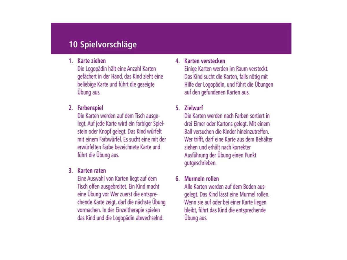 Die farbigen Bildkarten animieren Kinder mit Artikulationsschwierigkeiten zum Trainieren der für die Lautbildung wichtigen Sprechmuskeln.