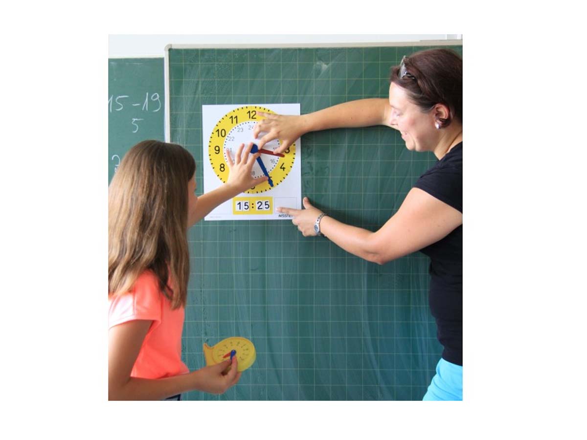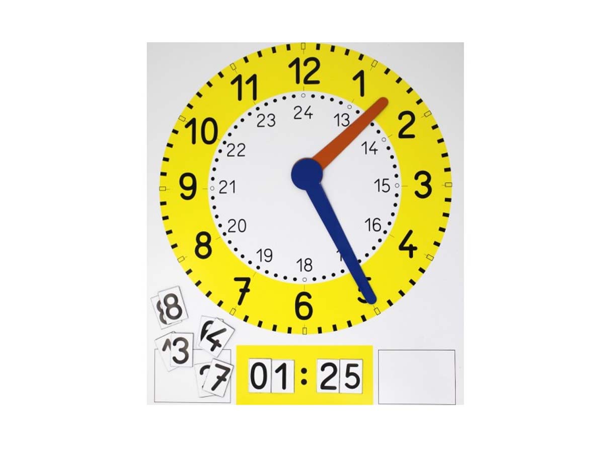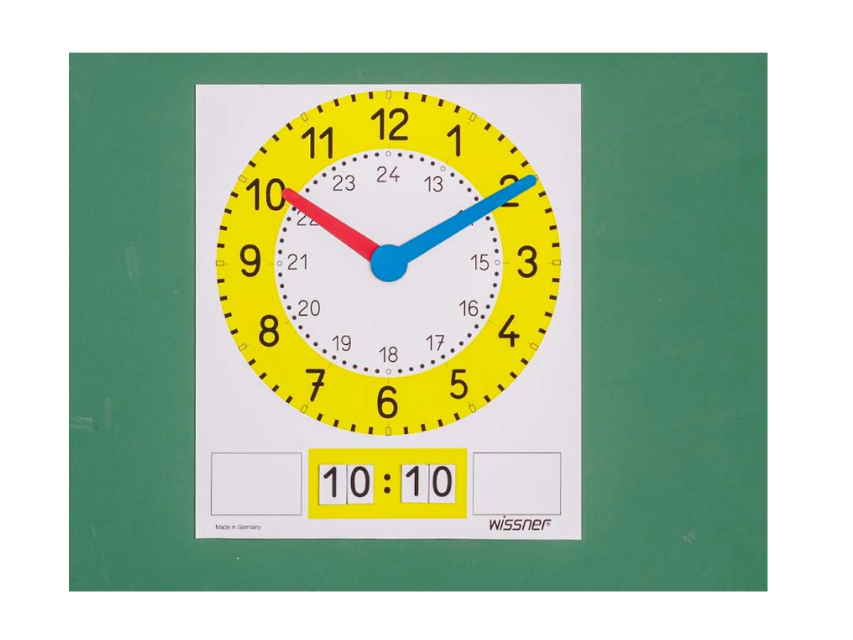 Der Satz beinhaltet eine mit einem Ziffernblatt bedruckte Magnetfolie, einen Zeigersatz und Digitalzahlensatz.