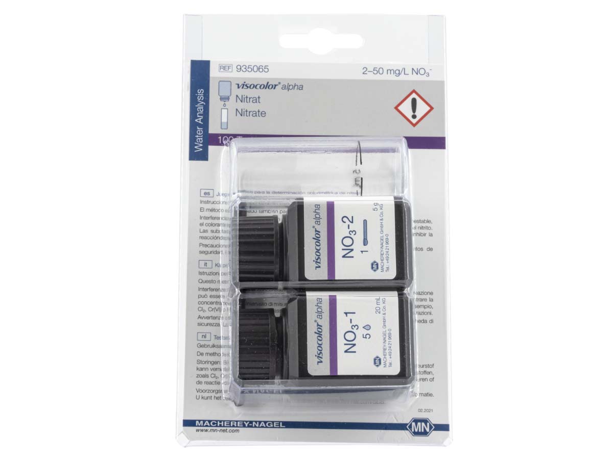 Kolorimetrisches Testbesteck zur einfachsten Bestimmung von Nitrat. VISOCOLOR alpha Nitrat stellt das einfachste kolorimetrische Testbesteck für Nitrat der VISOCOLOR-Reihe dar.