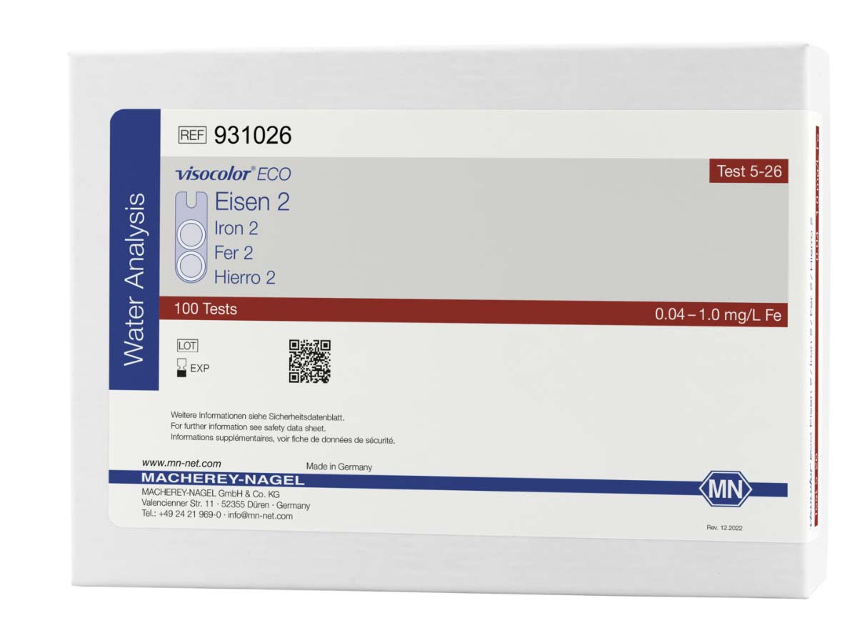 Kolorimetrisches Testbesteck zur Bestimmung von Eisen in Wasserproben. VISOCOLOR ECO Eisen 2 kombiniert einfache Durchführung mit hoher Messsicherheit durch Farb- und Trübungskompensation. Zur visuellen Bestimmung im Vergleich zu einer Farbkarte oder zur photometrischen Messung mit unseren Kompaktphotometern.