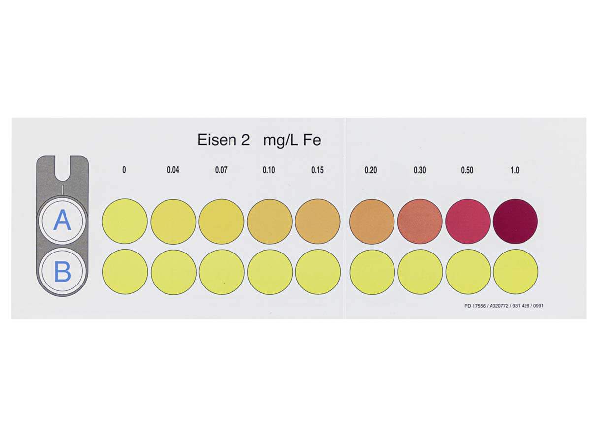 Abstufung: Eisen – 0 • 0,04 • 0,07 • 0,10 • 0,15 • 0,20 • 0,30 • 0,50 • 1,0 mg/L Fe