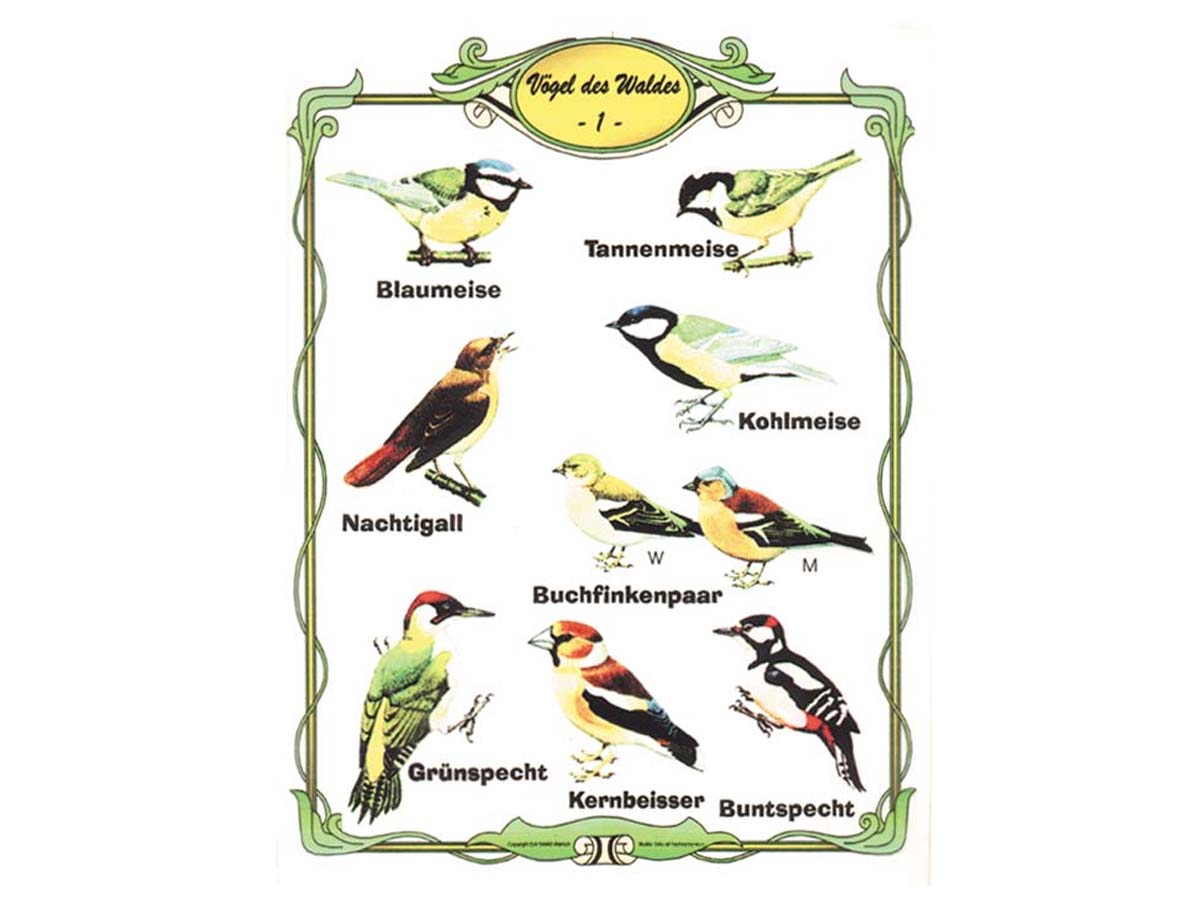 Blaumeise, Tannenmeise, Kohlmeise, Nachtigall, Buchfinkenpaar, Grünspecht, Kernbeisser und Buntspecht