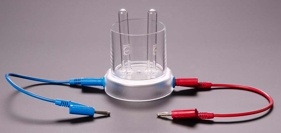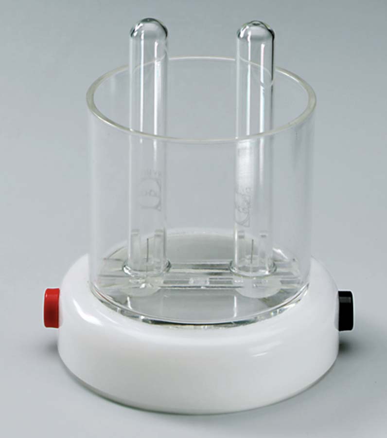 Säurebeständiges Kunststoffgefäß auf Sockel, mit Platin-Elektroden, 4-mm-Anschlussbuchsen und zwei Reagenzgläsern.