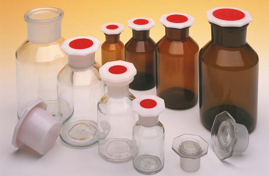 Weithalsglasflaschen mit NS PE-Stopfen für Feststoffe, nach DIN