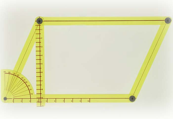 Winkelviereck mit Winkelmesser und beweglicher Höhenskala, zur Bestimmung der Länge der Seiten, der jeweiligen Winkel und Höhen.