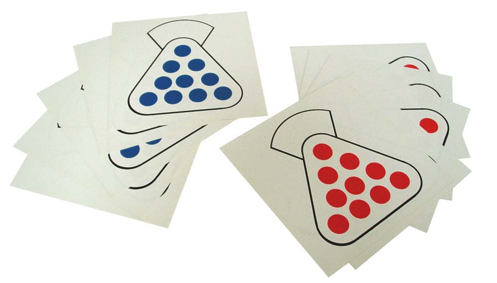 Diese Plättchen dienen zur Einführung in das Dezimalsystem. Sie lassen durch Abdecken einzelner Punkte die Darstellung jeder Zahl im Zahlenraum 1-100 zu. Sie eignen sich auch zur Addition und Subtraktion im Zahlenraum 1-100.
