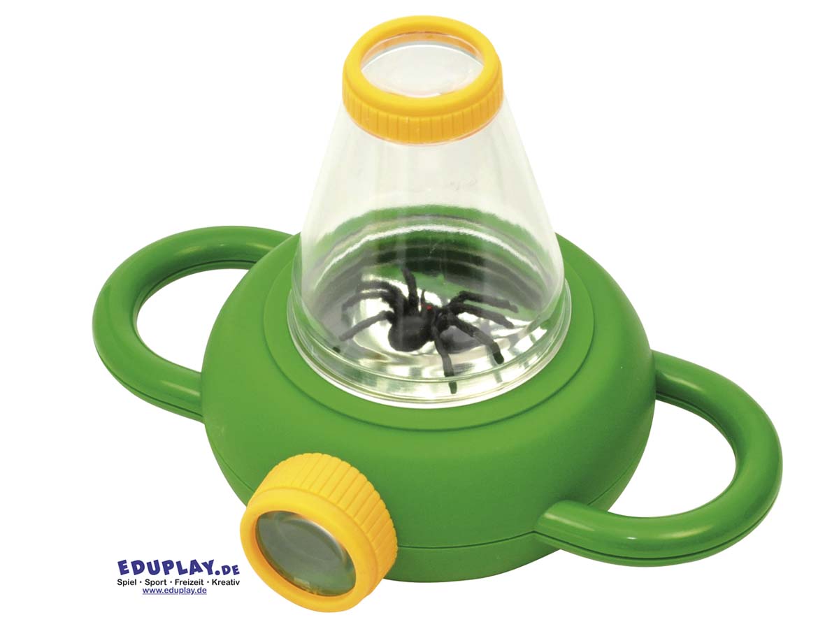 … diese 2-Wege Lupendose macht es möglich. Der innen liegende Spiegel ermöglicht das Um die-Ecke-Gucken, so dass man das Tier von unten betrachten kann. Mit praktischen Haltegriffen. 4fache Vergrößerung. Inkl. Kunststoffspinne.