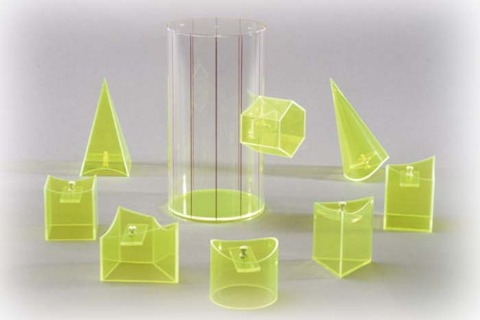 3-seitiges Prisma, Zylinder, Pyramide, Kegel, 6-seitiges Prisma, 2 Quadratprismen, Trapezprisma